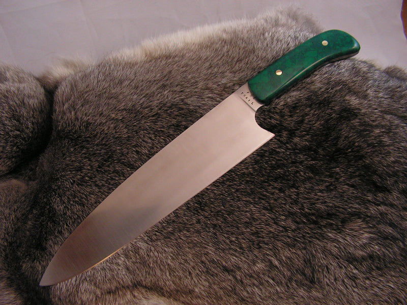 Chef’s knife with 440C stainless blade and synthetic jade handle.