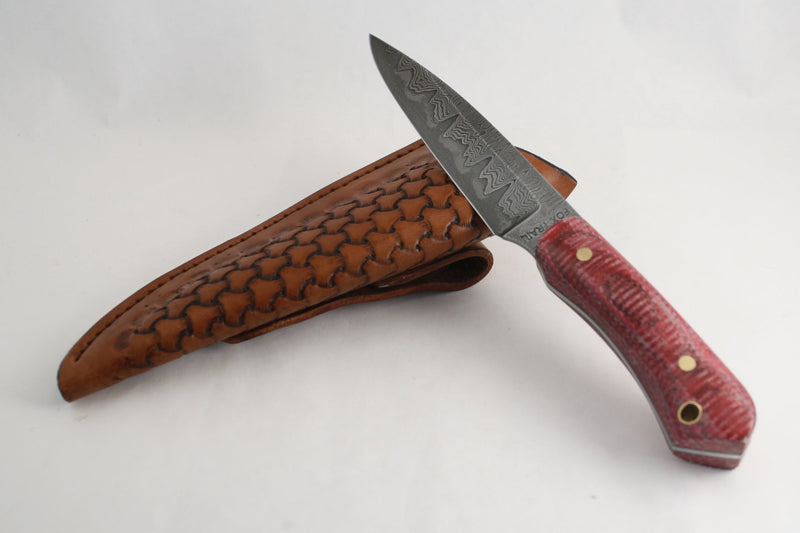 440C stainless blade with denim micarta‑style handle and leather pouch sheath.