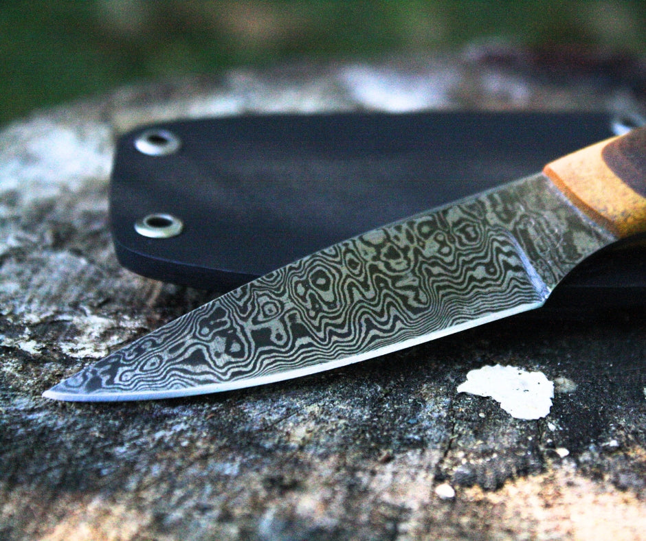 O‑1 tool steel blade with a handle crafted from an old Cub Scout uniform — featuring an inlaid button that doubles as a bow‑drill socket for primitive fire making.
