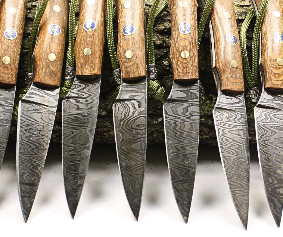Even in a matched set, no two are the same — Damascus patterns and natural leopard wood grain make every piece as unique as the hands that hold it.