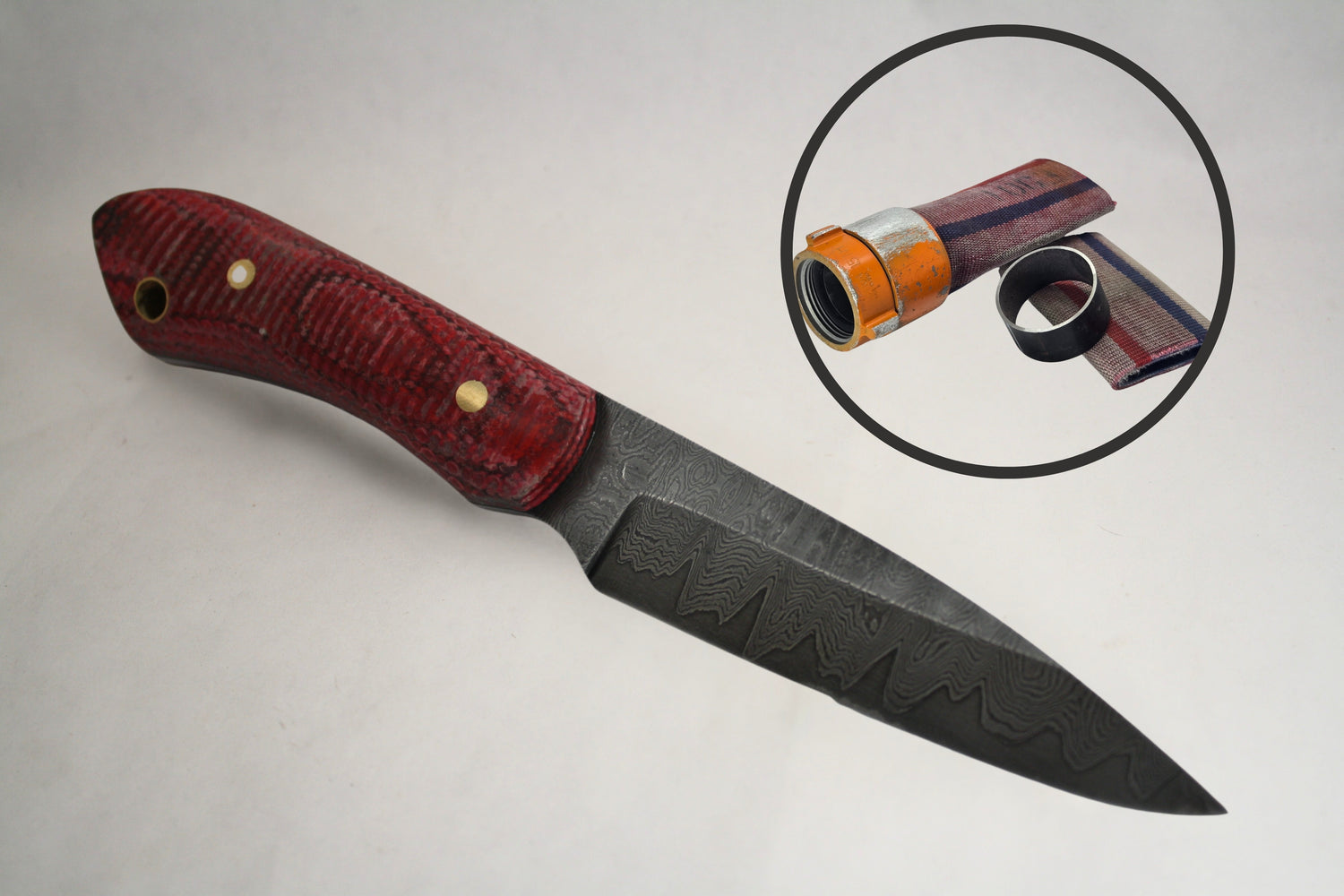 This custom blade was forged from fire sprinkler pipe and blade quality steel into a San Mai Damascus pattern. The handle is micarta made from decommissioned fire hose donated by Lake Mary Fire Department, capturing the spirit of the fire protection trade. Originally created for the Buddy Dewar Tournament, it was raffled to one lucky winner.