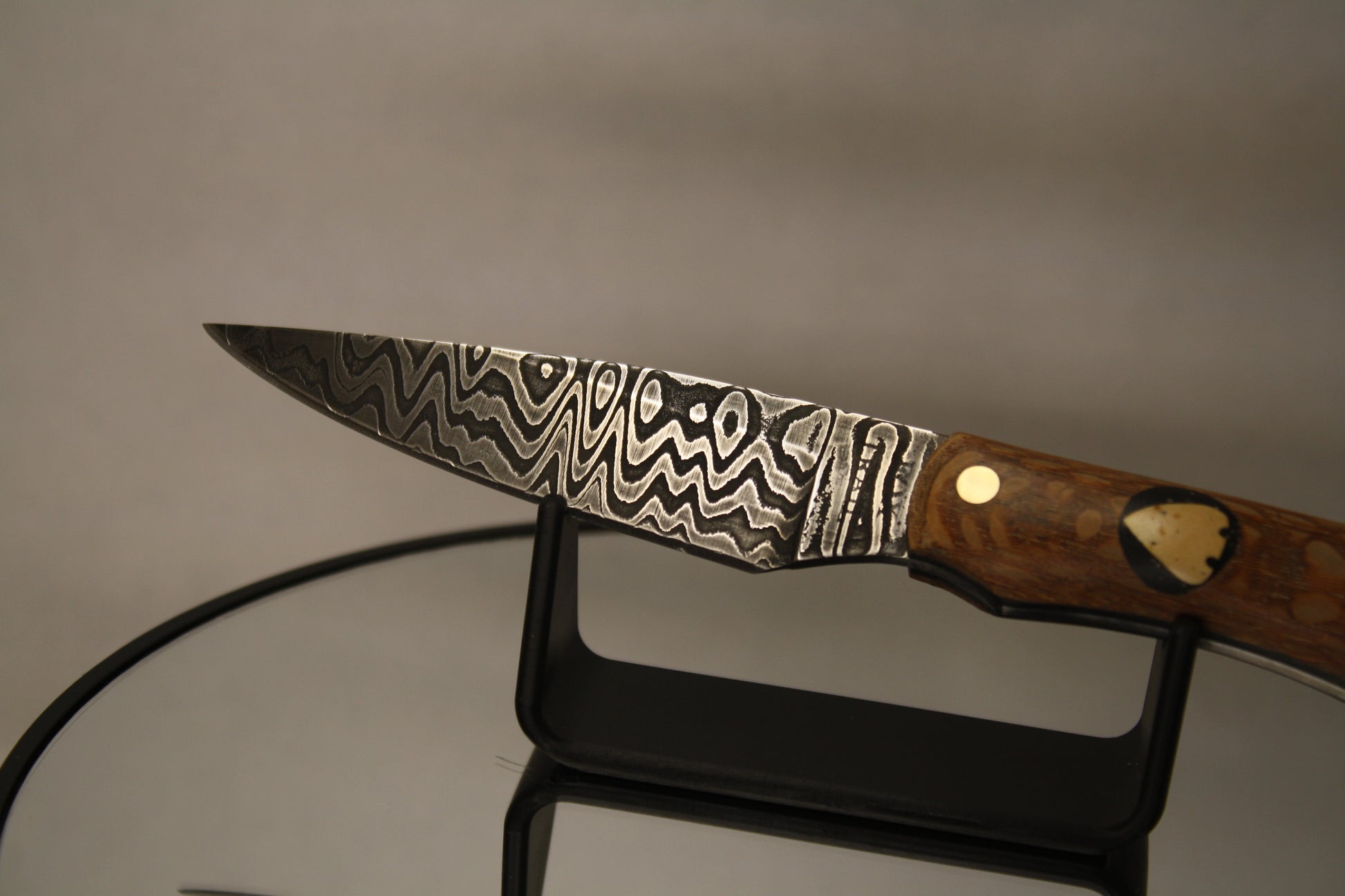 Hand-forged pattern-welded Damascus blade (15N20 & 1095) with a Leopardwood handle, black fiber spacer, brass pins, and a custom inlay featuring dyed epoxy and customer-supplied flint shaped into an arrowhead.